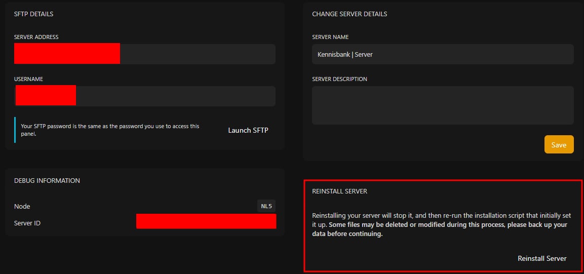 Stap 5: Ga vervolgens naar het kopje Settings hier vindt u en knop met "Reinstall Server" daa rmoet u vervolgens op klikken om uw nieuwe versie van FiveM te installeren naar uw paneel. Goed om te weten: ( Wanneer u op Reinstall Server drukt verwijderd dit geen bestanden! )