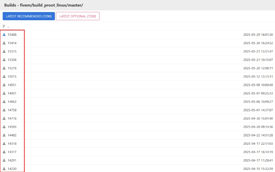 Hier vindt u allemaal FiveM versies hoe hoger de versie staat hoe hoe nieuwer de versie daadwerkelijk is. Het beste is om bij het updaten 1 van de hogere te kiezen.